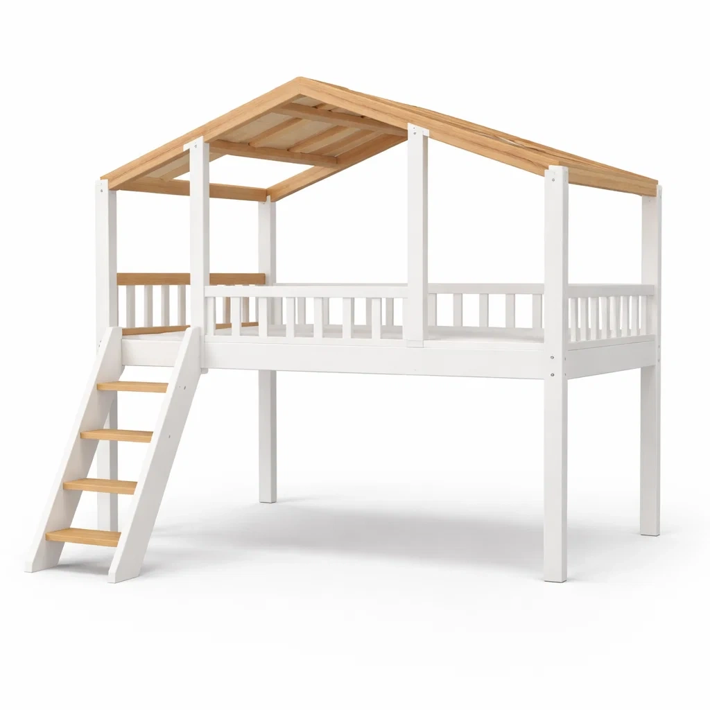 Ce lit mezzanine en forme de cabane est conçu pour offrir un espace de jeu et de sommeil pour les enfants. Fabriqué en pin massif et MDF, il garantit robustesse et durabilité. La structure en bois crée une atmosphère chaleureuse et sécurisée. L'échelle permet un accès facile au lit surélevé, et l'espace en dessous peut être utilisé pour jouer ou ranger des jouets.
