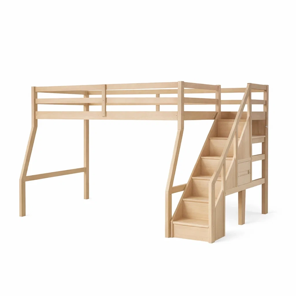 Ce lit mezzanine haut de 180 cm est fabriqué en bois massif, offrant un espace de couchage surélevé et un escalier intégré pour un accès sécurisé. Ainsi, il libère de l'espace au sol pour d'autres usages. La structure solide est conforme aux normes de sécurité européennes EN 747 pour lits superposés et mezzanines.
